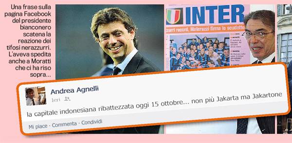 AGNELLI JAKARTONE BIANCONERO MORATTI – Una frase infelice su Twitter che ha scatenato l’ira dei tifosi dell’Inter. Parliamo di Andrea Agnelli, presidente della Juventus, che sul proprio profilo Twitter ha dato il benvenuto al nuovo proprietario nerazzurro Erick Thohir: “La capitale indonesiana ribattezzata oggi 15 ottobre. Non più Jakarta ma Jakartone”. Riferimento allo Scudetto dei veleni che l’Inter ha ricevuto dalla Figc che lo ha tolto dalle mani della Juventus per le famose vicende di Calciopoli. Insomma non un benvenuto solidale da parte del presidente bianconero. Ma la Gazzetta dello Sport ha rivelato che Agnelli martedì aveva avvisato il presidente uscente Moratti di questa battuta, il patron nerazzurro ci ha riso sopra, come la penserà Thohir?