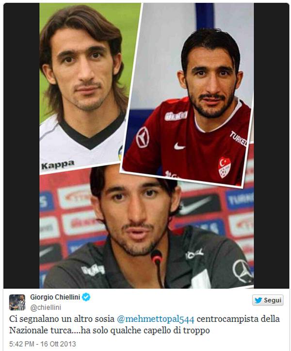 JUVENTUS SOSIA CHIELLINI MEHMET TOPAL – Giorgio Chiellini da qualche periodo ha iniziato a parlare dei suoi sosia nel mondo del calcio. E così dopo aver parlato del sosia capitano della Nazionale dell’Etiopia ieri ha scritto su twitter di aver trovato un altro sosia. Si tratta di Mehmet Topal, giocatore della Nazionale turca, un giocatore che ha tratti somatici identici al giocatore della Juventus solo con qualche capello di più, come ha anche segnalato lo stesso Giorgio Chiellini. Il difensore della Juventus quindi è a quota due sosia, chissà se questa particolare ricerca porterà il giocatore bianconero a trovarne altri.