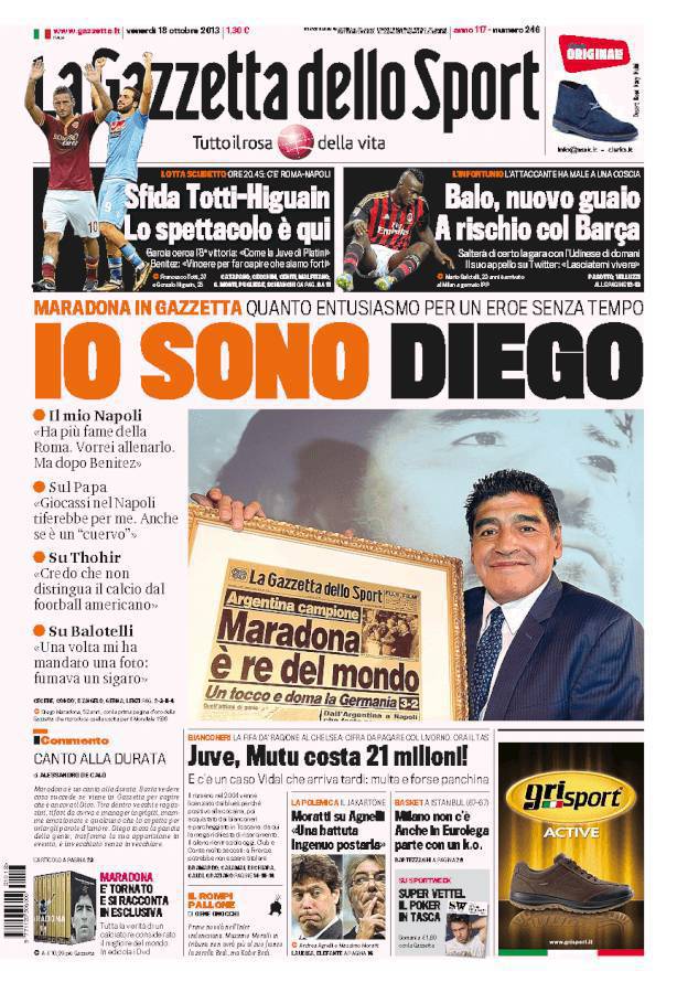 GAZZETTA MARADONA – Sulla Gazzetta dello Sport si parla di Maradona che ieri è andato a fare visita nella sede della Gazzetta dello Sport.