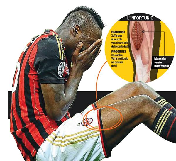 INFORTUNIO BALOTELLI BARCELLONA STOP MUSCOLARE – Mario Balotelli dovrà restare fermo per un problema muscolare alla coscia. Il fuoriclasse del Milan si è fatto male al ritorno dalla Nazionale, ma il problema è stato avvertito ieri durante l’allenamento. Balotelli salterà il match contro l’Udinese, a rischio anche quello contro il Barcellona. Per il Milan una statistica che fa un po’ paura, è il quarto giocatore del Milan che si fa male dal rientro dalle Nazionali. In precedenza ci sono stati problemi con Montolivo, Abate, El Shaarawy e oggi Balotelli. Un problema in più per Allegri mentre Balotelli chiude così una settimana di alta tensione.