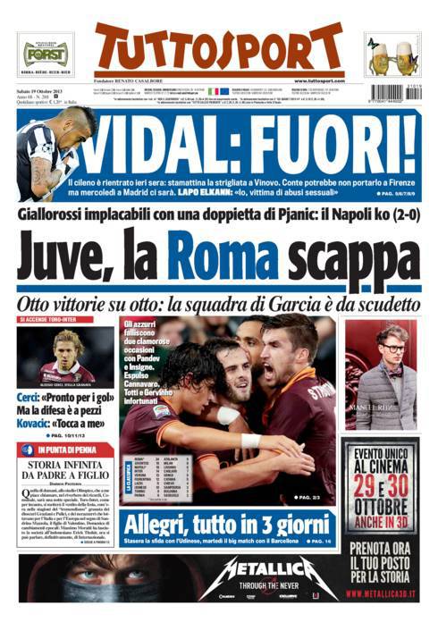 TUTTOSPORT VIDAL – Conte sembra voler punire il cileno che rimarrà fuori nel match contro la Fiorentina.