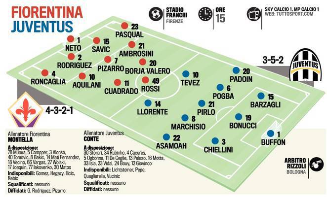 FIORENTINA JUVENTUS PROBABILI FORMAZIONI – Alle 15, allo stadio Franchi di Firenze, andrà in scena la grande sfida tra la Fiorentina di Vincenzo Montella e la Juventus di Antonio Conte. Entrambi i tecnici hanno suonato la carica consapevoli di non poter perdere terreno rispetto alle rivali. Per la grande sfida, Montella schiererà la squadra viola con il 4-3-2-1 con Neto in porta; Roncaglia, Rodriguez, Savic e Pasqual in difesa. A centrocampo, invece, ci saranno Aquilani, Pizarro e Ambrosini. Cuadrado e Borja Valero sulla trequarti a sostegno dell’unica punta che sarà Rossi. Conte risponde con il 3-5-2 con Buffon tra i pali. Barzagli, Bonucci e Chiellini in difesa. Asamoah e Padoin sulle fasce con Marchisio, Pirlo e Pogba a centrocampo. In attacco, invece, spazio alla coppia Llorente-Tevez.
