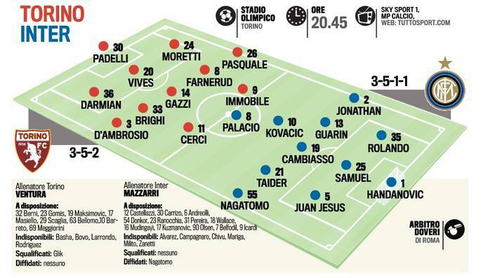 TORINO INTER PROBABILI FORMAZIONI – L’Inter di Walter Mazzarri, alla prima partita dell’era Thohir, è di scena allo stadio Olimpico di Torino dove sfiderà la squadra di Ventura. Entrambe le formazioni sono in cerca di punti. Ventura schiererà il Torino con il 3-5-2 con Padelli in porta. Darmian, Vives e Moretti in difesa. D‘Ambrosio, Brighi, Gazzi, Farnerud e Pasquale a centrocampo. Cerci e Immobile in attacco. Mazzarri risponde con il 3-5-1-1 con Handanovic tra i pali. Juan Jesus, Samuel e Rolando in difesa. Nagatomo, Taider, Cambiasso, Guarin e Jonathan a centrocampo. Kovacic sulla trequarti a sostegno di Palacio che sarà l’unica punta.