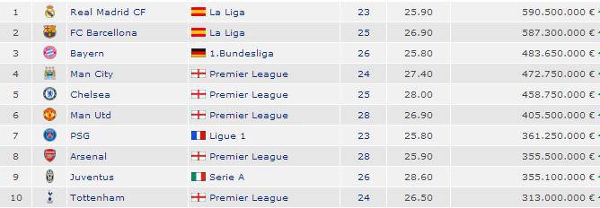 TOP 10 SQUADRE COSTOSE – Quali sono le squadre più ricche in questo momento? Il portale Transfermarkt.it ha provato a dare una risposta realizzando la TOP 10 dei dieci club dai giocatori più costosi. Al comando, come appare ovvio, troviamo quindi il Real Madrid con un bottino pari a 590.5 milioni di euro. Nei Blancos soltanto Cristiano Ronaldo e Bale valgono 180 milioni in due…A seguire ecco il Barcellona distaccato per 2 milioni di euro. Terzo il Bayern Monaco (483 milioni di euro). La prima delle italiane è la Juventus che vale 355 milioni di euro. Il Napoli (231 milioni di euro) è solo quattordicesimo mentre Milan (219 milioni di euro) e Inter (215 milioni di euro) si piazzano rispettivamente al sedicesimo e dicassettesimo posto.