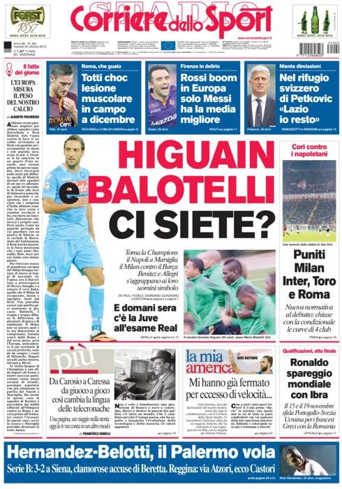 CORRIERE HIGUAIN BALOTELLI – Napoli e Milan si affidano ai propri cannonieri. Però entrambi potrebbero non giocare dall’inizio.
