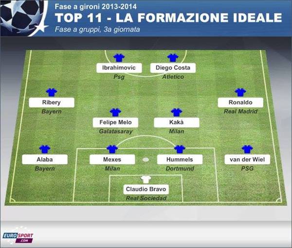 TOP 11 CHAMPIONS MILAN TERZA GIORNATA – La terza giornata di Champions League va in archivio. Le italiane portano a casa una vittoria, quella del Napoli a Marsiglia, un pareggio, quello del Milan contro il Barcellona e una sconfitta, quella della Juventus a Madrid. La redazione di Eurosport ha riportato la formazione ideale della terza giornata. Una formazione schierata con il 4-4-2 con due rossoneri presenti, ovvero Mexes in difesa e Kakà a centrocampo. In attacco Ibrahimovic-Diego Costa, potenza allo stato puro. Le fasce laterali con Ronaldo e Ribery, mentre gli altri difensori sono Hummels, Van der Wiel e Alaba. In porta il portiere della Real Sociedad Claudio Bravo.