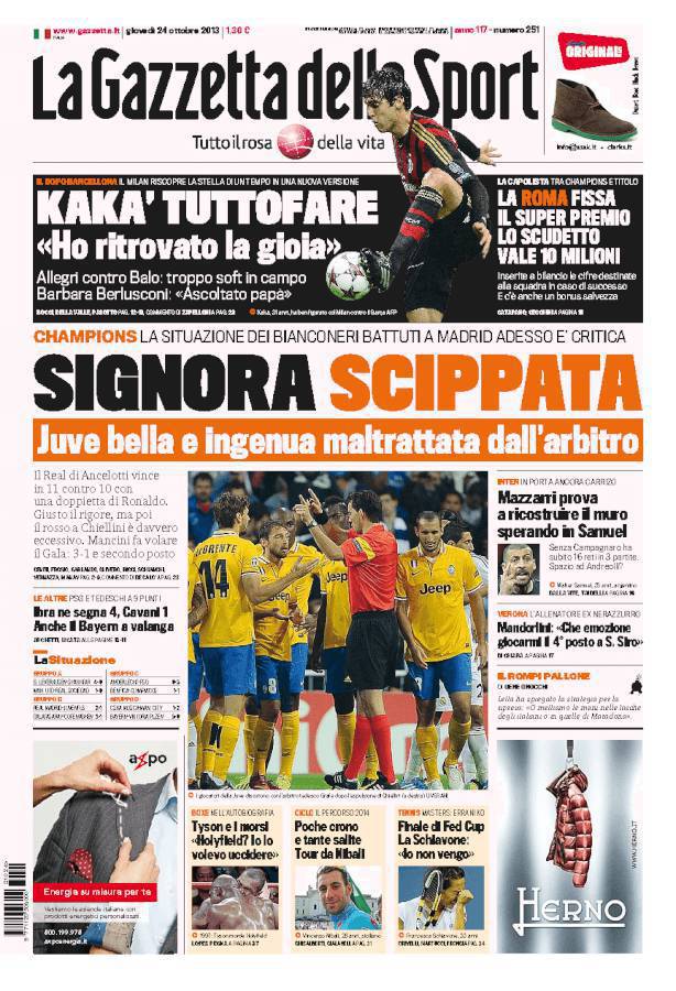 GAZZETTA JUVENTUS – Sulla Gazzetta dello Sport si parla della Juventus che ha perso due a uno contro il Real Madrid ma è stata penalizzata dall’arbitro.
