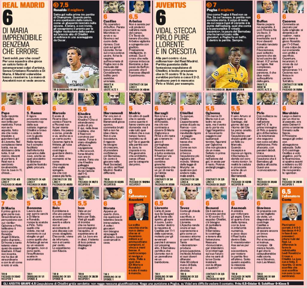 REAL MADRID JUVENTUS VOTI PAGELLE GAZZETTA DELLO SPORT – Eccovi i voti e le pagelle Gazzetta dello Sport di Real Madrid-Juventus, gara giocatasi ieri sera allo stadio Santiago Bernabeu, valevole per il terzo turno dei Gironi di Champions League, e conclusasi con il risultato di 2 a 1 in favore dei madrileni. Grande prova di Cristiano Ronaldo, autore di una doppietta, a cui ha risposto la stellina della Juve, Pogba, l’assistman della rete di Fernando Llorente del momentaneo pareggio. Male invece Chiellini, espulso, nonché Andrea Pirlo, troppo spento e negativo in una serata in cui serviva tutto il suo bagaglio tecnico e di esperienza.