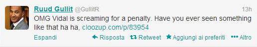 FOTO GULLIT VIDAL – Ieri sera Arturo Vidal si è reso protagonista di un gesto che ha fatto molto discutere. Ci riferiamo al momento in cui il cileno calcia il pallone, colpisce il terreno e, fra lo stupore generale, si avvicina all’arbitro per protestare. Chiedeva il rigore? Non lo sappiamo. In ogni caso in molti hanno ironizzato tra cui la leggenda del calcio Gullit che su Twitter pubblica le seguenti parole: “Vidal sta urlando per un rigore. Avete mai visto qualcosa del genere? ahaha”.