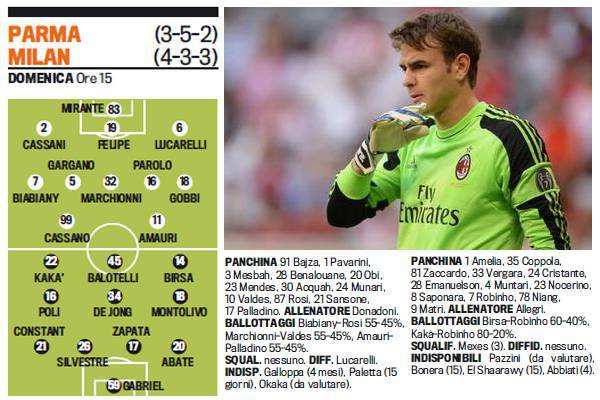 PARMA MILAN PROBABILI FORMAZIONI GABRIEL SILVESTRE – Prima la vittoria di misura contro l’Udinese poi il pareggio casalingo in Champions League contro il Barcellona. Il Milan domenica cercherà di vincere alle ore 15 al Tardini contro il Parma. Solo così i rossoneri potranno risalire la china in classifica. Il tecnico del Milan Massimiliano Allegri ha deciso di confermare alcuni calciatori che hanno fatto bene contro l’Udinese. Si tratta di Gabriel e Silvestre. Il portiere brasiliano sarà titolare al posto di Abbiati che è infortunato, il secondo sarà Amelia. Mentre il difensore argentino prenderà il posto dello squalificato Mexes. Nel Parma occhio all’ex Antonio Cassano. Ecco le probabili formazioni secondo la Gazzetta dello Sport.