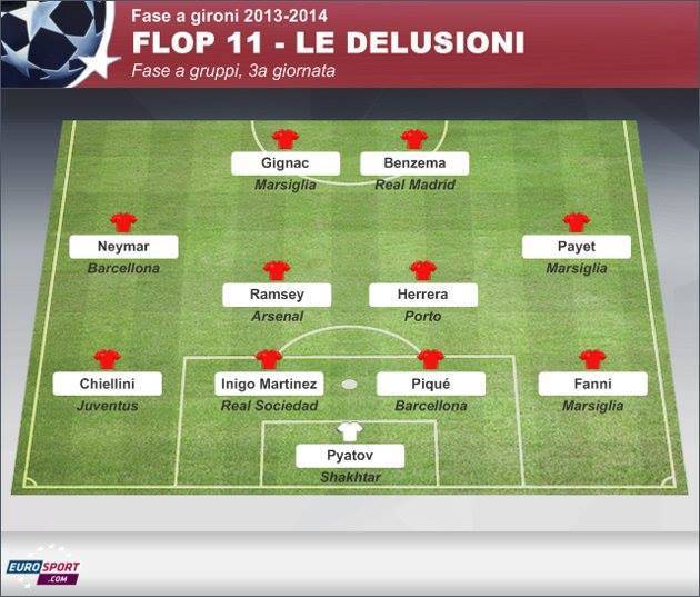 TERZA GIORNATA CHAMPIONS LEAGUE FLOP CHIELLINI – Dopo la top 11 Champions League della terza giornata, è il momento della flop Champions. E nella formazione c’è anche un italiano ovvero Giorgio Chiellini, espulso nel match contro il Real Madrid. Lui è il terzino sinistro della formazione schierata con il 4-4-2, con Inigo Martinez e Piqué centrali e Fanni a destra. A centrocampo Neymar, Ramsey, Herrera, Payet, mentre Gignac e Benzema in attacco. Insomma una squadra molto importante fatta di nomi di assoluto livello che però non hanno fatto sicuramente bene nella terza giornata di campionato. La presenza di Chiellini dimostra la giornataccia dei bianconeri al Bernabeu anche per colpa dell’arbitro.