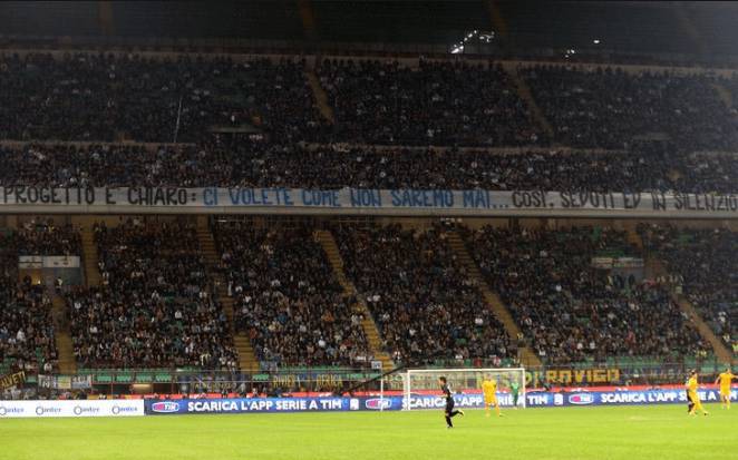 INTER PROTESTA CUIRVA – La protesta della Curva interista rischio squalifica (è aperta, ma con la condizionale) è iniziata ieri nell’anticipo contro il Verona. La protesta è iniziato con uno striscione che diceva: «Il progetto è chiaro, ci volete come non saremo mai. Così, seduti ed in silenzio». E per circa dieci minuti, i posti della curva sembravano quelli della tribuna, silenziosa e pacifica. La protesta è stata ironica ma senza quei cori contro Napoli e i napoletani che hanno portato alla regola della discriminazione territoriale. La Curva Nord, dunque, ha recepito il messaggio congiunto di Inter e Milan che avevano invitato i tifosi a protestare senza fare del male alle società.