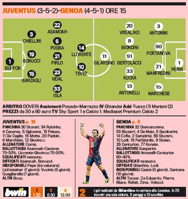 JUVENTUS GENOA PROBABILI FORMAZIONI – Il match contro il Genoa, in programma questo pomeriggio alle 15, per la Juventus arriva al momento giusto. I bianconeri, infatti, dopo due pesanti ko in campionato e in Champions, cercheranno il riscatto contro una formazione che avrà ancora una volta il suo leader in Alberto Gilardino. Per la sfida contro la squadra di Gasperini, Conte tornerà alla difesa a tre con il consueto modulo 3-5-2 con Buffon tra i pali; Barzagli, Bonucci e Chiellini in difesa; Isla, Vidal, Pirlo, Pogba e Asamoah a centrocampo; Tevez e Llorente in attacco. Gasperini risponde con il 4-5-1 con Perin in porta; Antonini, Portanova, Manfredini e Marchese in difesa; Vrsaljko, Biondini, Bertolacci, Kucka e Antonelli a centrocampo con Gilardino unica punta.