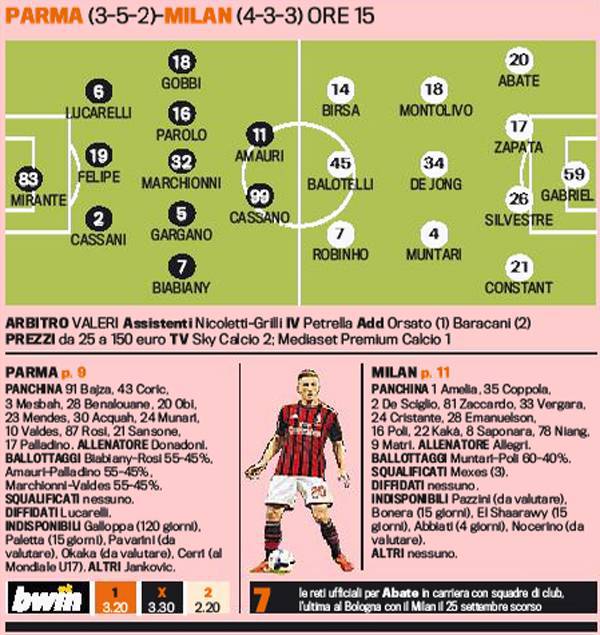 PARMA MILAN PROBABILI FORMAZIONI – Il Milan, dopo il pareggio in Champions contro il Barcellona, affronta in trasferta il Parma di Antonio Cassano. La formazione di Donadoni alterna risultati altalenanti mentre i rossoneri sembrano aver finalmente intrapreso la strada giusta. Donadoni schiererà il Parma con il 3-5-2 con Mirante in porta, Lucarelli, Felipe e Cassani in difesa. Gobbi, Parolo, Marchionni, Gargano e Biabiany a centrocampo. Amauri e Cassano in attacco. Allegri risponde con il 4-3-3 con Gabriel tra i pali; Abate, Zapate, Silvestre e Constant in difesa. Montolivo, De Jong e Muntari a centrocampo. In attacco spazio a Birsa, Balotelli e Robinho.