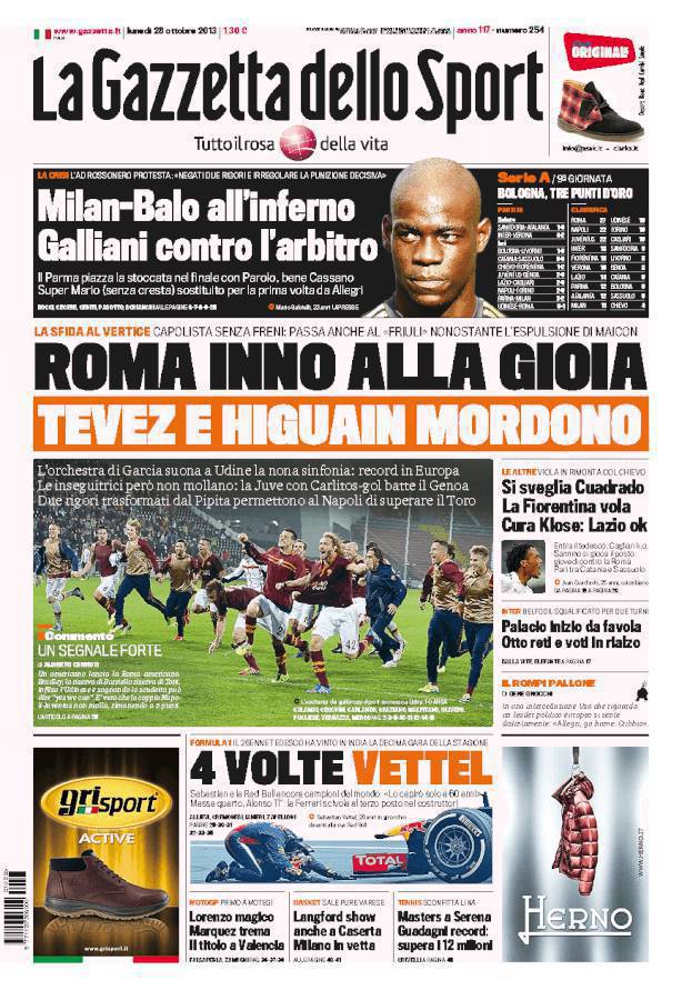 GAZZETTA ROMA TEVEZ HIGUAIN – Nona vittoria su nove partite per la Roma di Garcia sempre più in testa alla classifica. Juventus e Napoli vincono.