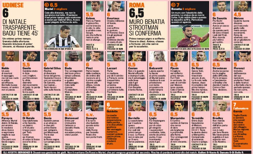 UDINESE ROMA VOTI PAGELLE GAZZETTA MAICON BENATIA – La Roma non si ferma proprio più. I giallorossi vincono anche a Udine e sono alla nona vittoria consecutiva su nove partite. Un ruolino di marcia impressionante, tante vittorie per i giallorossi che sono in testa alla classifica in maniera solitaria. Nel pomeriggio giallorosso spicca Benatia, ex difensore dell’Udinese, assolutamente insuperabile per l’attacco dell’Udinese. Male invece Maicon che si becca un 4,5 e soprattutto un cartellino rosso per somma di ammonizioni in maniera molto sciocca. Nell’Udinese bene Muriel che coglie anche un palo, in ombra Di Natale. Garcia ora chiede ai suoi di continuare a vincere lo Scudetto. Voti e pagelle della Gazzetta dello Sport.