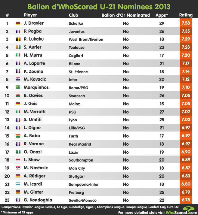 FOTO WHOSCORED PALLONE D’ORO UNDER 21 DRAXLER POGBA – Continuano a far discutere i criteri di assegnazione del Pallone D’Oro, massimo riconoscimento individuali per i calciatori del globo. WhoScored, noto portale britannico che presenta quotidianamente dati statistici e grafiche davvero spettacolari, sfruttando i dati raccolti da inizio gennaio ad oggi, ha deciso di assegnare il simbolico pallone d’oro Under 21. A vincere questo particolare premio è Julian Draxler, fenomeno di proprietà dello Schalke 04, subito seguito da Paul Pogba, centrocampista classe 1993 della Juventus. Sorprendentemente, il primo degli italiani è il terzino del Cagliari Murru, ben 7 posizioni sopra Marco Verratti.