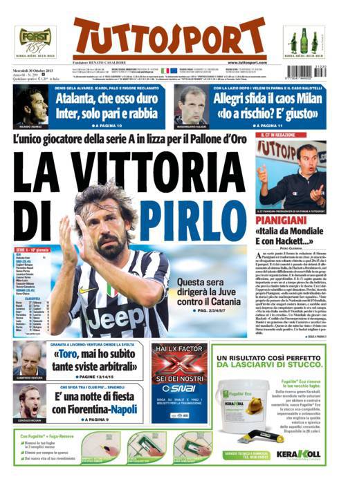 TUTTOSPORT PIRLO – Pirlo unico giocatore italiano presente nella lista dei 23 al Pallone d’Oro, traguardo importante per lo juventino.