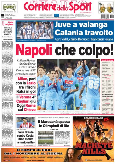 CORRIERE NAPOLI – Il Napoli vince due a uno a Firenze grazie ai gol di Callejon e Mertens. Ma la Fiorentina è furibonda per il calcio di rigore non dato all’ultimo minuto per fallo su Cuadrado.
