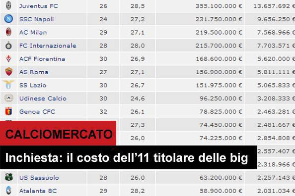 CALCIOMERCATO VALORE BIG SERIE A – Vi siete mai chiesti quanto sono costati i giocatori titolari delle principali squadre d’Italia? Una domanda a cui ha cercato di dare una risposta la redazione di Calciomercatonews.com. Sfruttando i dati del noto portale Transfermarkt.it, e tenendo conto solo dei milioni di euro fisicamente spesi, senza l’aggiunta quindi di eventuali contropartite tecniche, evincono alcuni dati interessanti. Si scopre ad esempio che l’11 bianconero è quello che è costato di più, e forse anche per questo, che negli ultimi anni ha dominato in Italia. Sorprende il Milan, fra le big quella costata di meno, addirittura meno di 50 milioni di euro, e meno della Fiorentina e del solo Buffon. Il Napoli supera il tetto dei 110 milioni, piazzandosi al secondo posto davanti all’Inter, ferma a quota 99. Infine, sono 70 i milioni di euro spesi dalla Roma.