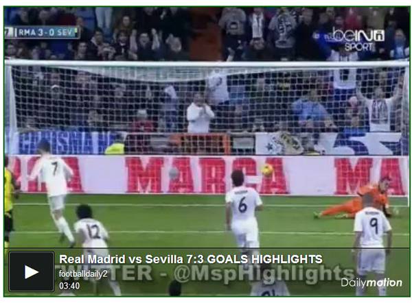 VIDEO REAL MADRID RONALDO – Il Real Madrid cancella il Clasico strapazzando al Bernabeu il povero Siviglia per 7-3. Nonostante il risultato gli ospiti sono stati bravi a riaprire il match sul 3-0 portandosi sul 3-2 ma non è bastato perché le Merengues si sono scatenate. Cristiano Ronaldo ha segnato 3 gol rispondendo alle dichiarazioni di Blatter mentre Mr 100 milioni Bale ha segnato una doppietta così come Benzema. Nel video, tutti gli hilights della sfida.