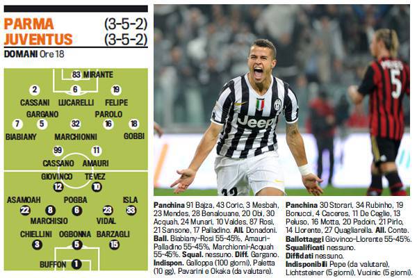 PARMA JUVENTUS PROBABILI FORMAZIONI GIOVINCO TEVEZ CASSANO AMAURI – Neanche il tempo di tirare il fiato che è nuovamente tempo di Serie A. Domani si ritorna in campo con i primi anticipi del sabato: Parma-Juventus apre l’11° turno della Serie A con una gara che, negli ultimi anni, ha sempre regalato sorprese al Tardini. La squadra di Donadoni, dopo la sconfitta contro il Genoa, vuole tornare a collezionare punti tra le mura amiche, come fatto appena un weekend fa contro il Milan; la Juventus invece, fresca della doppia vittoria con Genoa e Catania, viaggia ad altissimi ritmi, sperando in uno stop improvviso dell’invincibile Roma. Vi proponiamo le probabili formazioni della Gazzetta dello Sport sulla gara: Giovinco scalpita per un posto accanto a Tevez…
