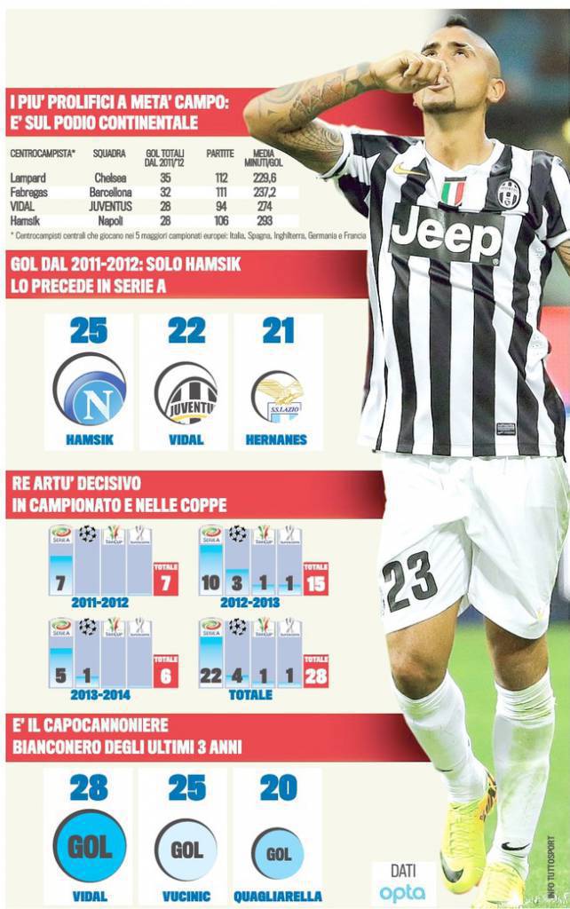 FOTO JUVENTUS VIDAL – E’ diventato subito un leader della Juventus di Antonio Conte, Arturo Vidal, centrocampista bianconero capace di trascinare i suoi compagni alla conquista di due scudetti consecutivi. I numeri parlano chiaro: negli ultimi 3 anni, anche grazie ad un’invidiabile continuità, Vidal è riuscito ad andare ben 28 volte a segno, risultando essere il capocannoniere della gestione contiana della Juventus. La redazione di Tuttosport ha presentato stamani un’interessante infografica, realizzati con i dati Opta, che mettono in risalto le pazzesche cifre del guerriero di casa Juventus. Più di un tesoro: con Vidal la Juve ha trovato una valanga d’oro.