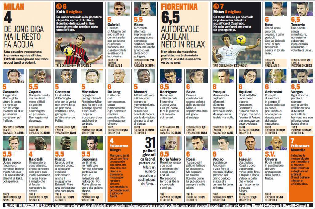 MILAN FIORENTINA VOTI PAGELLE GAZZETTA DELLO SPORT – Eccovi i voti e le pagelle Gazzetta dello Sport di Milan-Fiorentina, sfida che si è giocata ieri sera allo stadio San Siro e che si è conclusa con il risultato di 0 a 2 in favore della Viola. Bruttissima prova di Balotelli, bocciato inesorabilmente dalla Rosa con un 4 in pagella. Si salva fra i rossoneri solo Kakà, voto 6, che da leader cerca di fare qualcosa per scuotere i suoi, senza riuscirci. Migliore in assoluto del match è la sorpresa Matos, che non fa assolutamente rimpiangere lo squalificato Cuadrado.
