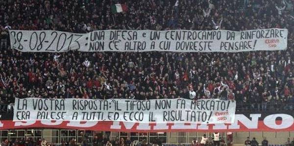 MILAN CONTESTAZIONE CURVA SUD – 12 punti in classifica, 17 gol fatti e 19 subiti: sono questi i numeri della crisi del Milan che stanno condannando la squadra di Allegri ad un campionato anonimo, molto diverso da quello che i tifosi si aspettavano. Contro la Fiorentina è arrivato il colpo di grazie a la contestazione dei tifosi rossoneri, stanchi di dover sentire false promosse come quelle di rinforzi in arrivo a gennaio. E così, ieri, gli ultra rossoneri hanno esposto degli striscioni che esprimono lo stato d’animo dei tifosi del Milan e che dicevano quanto segue: “28/08/2013: una difesa e un centrocampo da rinforzare, non c’è altro a cui dovreste pensare“. E poi: “La vostra risposta: Il tifoso non fa mercato! Era palese a tutti ed ecco il risultato!”.