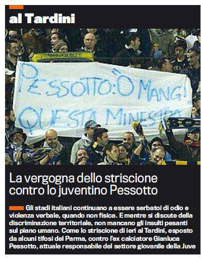 PARMA JUVENTUS STRISCIONE CONTRO PESSOTTO – Anche Parma-Juventus sarà ricordata come una delle tante partite in cui i tifosi hanno dato dimostrazione del peggio. Sulle curve dello stadio Tardini, infatti, ad un certo punto della gara, è stato esposto uno striscione contro lo juventino Gianluca Pessotto. Lo striscione diceva: “Pessotto “o mangi questa minestra” con riferimento alle vicende personali che hanno colpito l’attuale dirigente bianconero. Gli stadi italiani, dunque, ancora una volta tornano ad essere lo scenario di episodi scandalosi che dovrebbero essere censurati con punizioni esemplari. A quanto pare le ultime vicende sui cori di discriminazione razziale non sono serviti a niente.