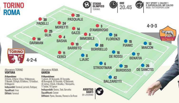 TORINO ROMA PROBABILI FORMAZIONI – La Roma deve rispondere alle vittorie del Napoli e della Juventus e dovrà farlo in trasferta contro il Torino di Giampiero Ventura. I Granata arrivano alla sfida con la capolista da un momento difficile durante il quale hanno perso molti punti per un calo di concentrazione e cercheranno una preziosa vittoria casalinga che manca dallo scorso agosto. I giallorossi, invece, inseguono l’undicesima vittoria consecutiva per mantenere a distanza le inseguitrici. Ventura schiererà il Toro con il 4-2-4 con Padelli in porta, Darmian, Glik, Moretti e Pasquale in difesa. Basha e Gazzi in mezzo al campo. Cerci, Barreto, Immobile e D’Ambrosio sulla linea d’attacco. Rudi Garcia risponde con il 4-3-3 con De Sanctis tra i pali; Maicon, Benatia, Burdisso e Balzaretti in difesa. Strootman, De Rossi e Pjanic a centrocampo. Florenzi, Borriello e Ljajic in attacco.