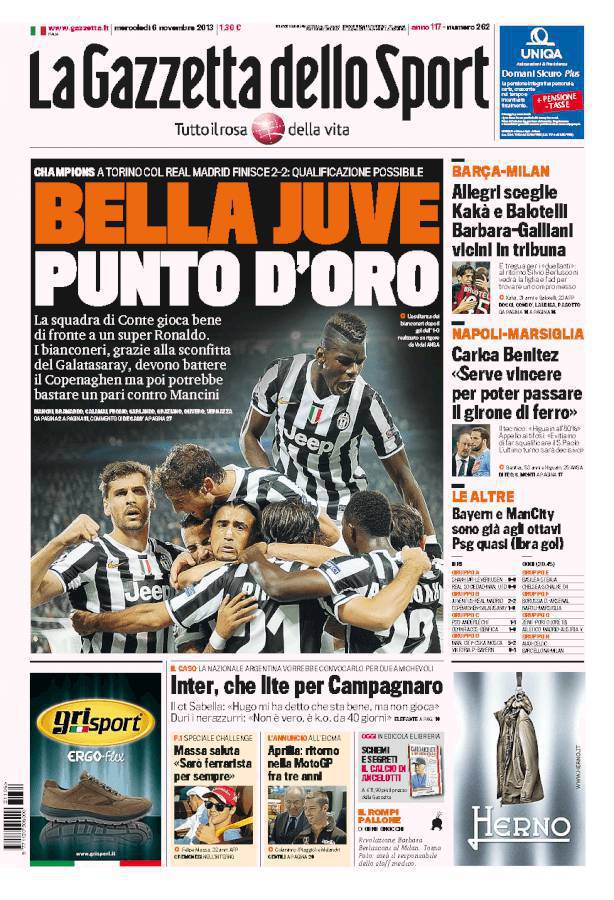 GAZZETTA JUVENTUS – La Juventus pareggia due a due in casa contro il Real Madrid e può sperare nella qualificazione.