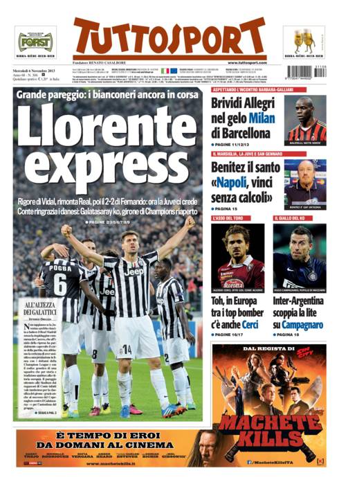 TUTTOSPORT LLORENTE – Grazie a un gol di Llorente la Juventus pareggia due a due contro il Real Madrid ed è ancora in corsa per la qualificazione in Champions League.