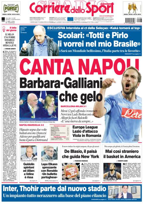 CORRIERE NAPOLI MILAN – Sul Corriere dello Sport si parla del Napoli che vince contro il Marsiglia, mentre gelo tra Barbara Berlusconi e Galliani al Camp Nou con il Milan che perde tre a uno.