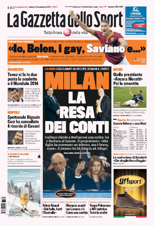 GAZZETTA MILAN – Sulla Gazzetta dello Sport si parla del Milan con Galliani che questa sera incontrerà Berlusconi e chiederà spiegazioni sul futuro timoniere dei rossoneri.