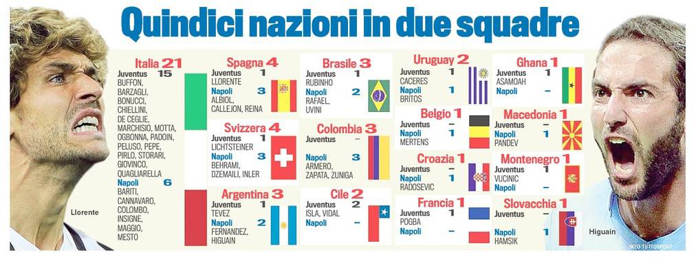 FOTO JUVENTUS NAPOLI NAZIONI – Più di una sfida scudetto, più di un match sentito da entrambe le tifoserie, molto più di una semplice partita di calcio: Juventus-Napoli è uno spot meraviglioso per il nostro sport preferito, avendo il potere di scrivere in 90 minuti un pezzo di storia del calcio, mostrando qualità calcistiche davvero impressionanti. Una sfida tra due società agli antipodi, che vantano all’interno delle proprie squadre ben 49 calciatori provenienti da 15 nazioni diverse. Ovviamente, come ci mostra questa grafica del Corriere dello Sport, la colonia più rappresentata è quella italiana con un totale di 21 calciatori in totale.