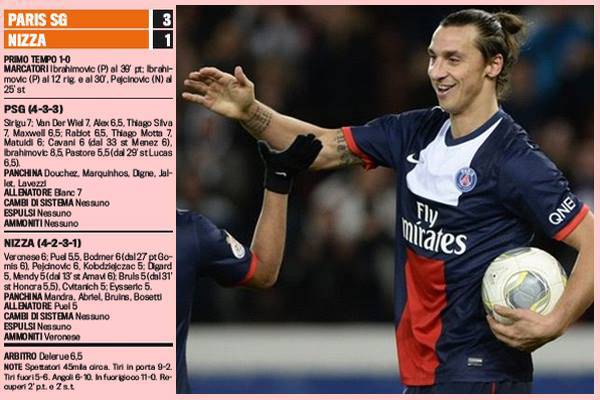 FOTO PARIS SAINT GERMAIN NIZZA 3-1 VOTI PAGELLE GAZZETTA DELLO SPORT IBRAHIMOVIC – Ancora una vittoria del Paris Saint Germain, ancora una volta marchiata a fuoco da Zlatan Ibrahimovic. Il fenomeno svedese non ha intenzione di smettere di segnare ed anche ieri ha deliziato i suoi tifosi con una magnifica tripletta che gli è valsa un grandioso, e meritato, 8,5 in pagella. Spettacolare anche la prestazione del portierone italiano, Stefano Sirigu, autore di interventi prodigiosi che hanno salvato il risultato in più di un’occasione. Per leggere tutti i voti e le pagelle della gara, basterà dare un’occhiata alla grafica della Gazzetta dello Sport.