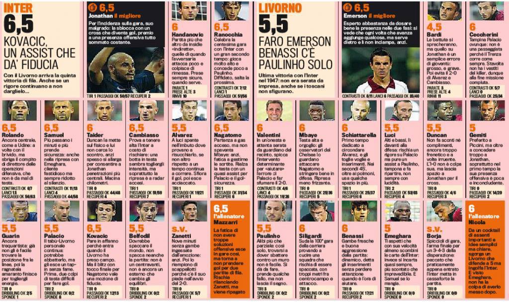 INTER LIVORNO VOTI PAGELLE – L’Inter trova la vittoria contro il Livorno ma soprattutto riabbraccia dopo sei mesi il capitano Zanetti. I nerazzurri hanno battuto i toscani per 2-0 grazie all’autogol di Bardi nel primo tempo e al gol di Nagatomo nel recupero della ripresa. E’ stata ultima gara per Moratti e l’ultima sua vittoria da azionista di maggioranza. La sfida parte a ritmi lenti, il Livorno non regala spazi e l’Inter fatica fino al 26′, minuto della prima mezza occasione: colpo di testa di Palacio, pallone a lato. Il gol del vantaggio lo confeziona interamente Bardi: cross di Jonathan da destra, il portiere amaranto anticipa tutti in uscita bassa ma non blocca la sfera, mandandola in porta per un autogol che ha del clamoroso. Nella ripresa, poi, la vittoria è legittimata dalla rete di Nagatomo.