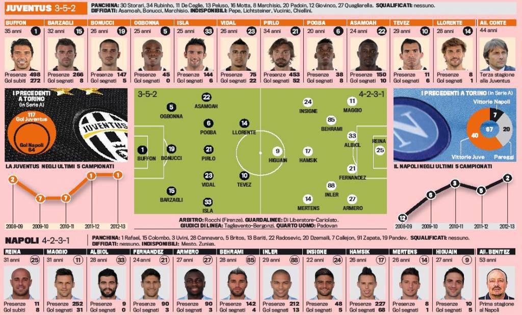JUVENTUS NAPOLI PROBABILI FORMAZIONI – L’attesa è finita: questa sera, alle 20.45, allo Stadium di Torino andrà in scena la grande sfida tra le due seconde del campionato, Juventus e Napoli. Conte e Benitez accendono la vigilia: ognuno dei due considera favorito l’altro anche se sanno che un passo falso potrebbe essere fatale per il proseguo in campionato. Antonio Conte schiererà la Juventus con il 3-5-2 con Buffon in porta; Barzagli, Bonucci e Ogbonna in difesa. Isla, Vidal, Pirlo, Pogba e Asamoah a centrocampo. In attacco, invece, la coppia sarà formata da Tevez e Llorente. Benitez risponde con il 4-2-3-1 con Reina tra i pali; Maggio, Albiol, Fernandez e Armero in difesa. Behrami e Inler davanti alla difesa. Insigne, Hamsik e Mertens sulla trequarti. Higuain unica punta.