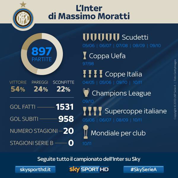 INTER MORATTI- Sy Sport a riportato le statistiche dell’Inter di Moratti. In questi anni (dal febbraio 1995) i nerazzurri hanno giocato ben 897 partite sotto la sua gestione. Sono 484 le vittorie, 215 i pareggi e 198 le sconfitte. I gol fatti sono 1531 (i più importanti sono però indubbiamente i due segnati da Milito a Madrid contro il Bayern Monaco), e 958 quelli subiti. Sono invece 5 gli scudetti vinti, quattro le Coppe Italia, quattro Supercoppe Italiane, una Champions League, un Mondiale per club e una Coppa Uefa (il primo trofeo, nel ’97-98). In totale le competizioni vinte sono quindi 16. Sono quattro gli allenatori che hanno portato i nerazzurri al successo: Simoni, Mancini, Mourinho e Benitez.