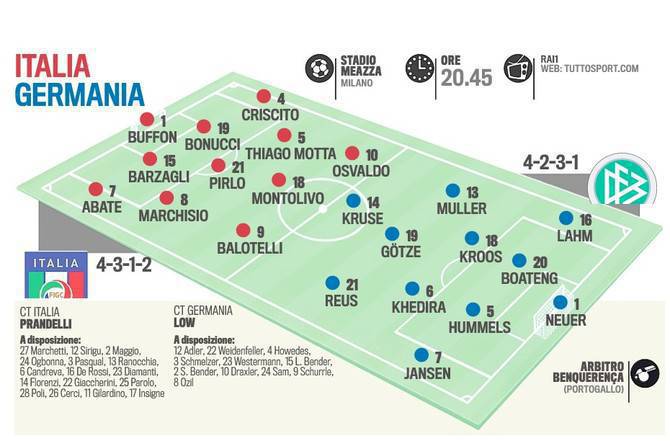ITALIA GERMANIA PROBABILI FORMAZIONI – Amichevole di lusso questa sera, alle 20.45 a San Siro tra Italia e Germania. I tedeschi non battono gli Azzurri dal 1995 e l’ultima sconfitta porta la firma di Mario Balotelli che li trafisse per 2-0 nella semifinale dell’Europeo. Cesare Prandelli non si nasconde e ha già ufficializzato la formazione degli Azzurri che si schiereranno con il 4-3-1-2 con Buffon in porta, Abate, Bonucci, Barzagli e Criscito in difesa. Marchisio, Pirlo e Thiago Motta a centrocampo. Montolivo sulla trequarti a sostegno di Balotelli e Osvaldo. Low risponde con il 4-2-3-1 con Neuer tra i pali; Lahm, Boateng, Hummels e Jansen in difesa. Kroos e Khedira davanti alla difesa. Muller, Gotze e Reus sulla trequarti. Kruse unica punta.
