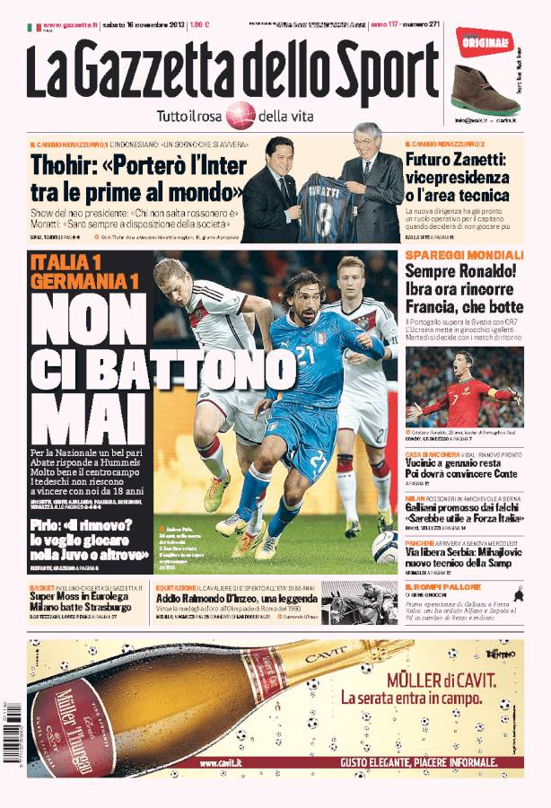 GAZZETTA ITALIA – Finisce uno a uno l’amichevole tra Italia e Germania, i tedeschi non riescono a batterci.