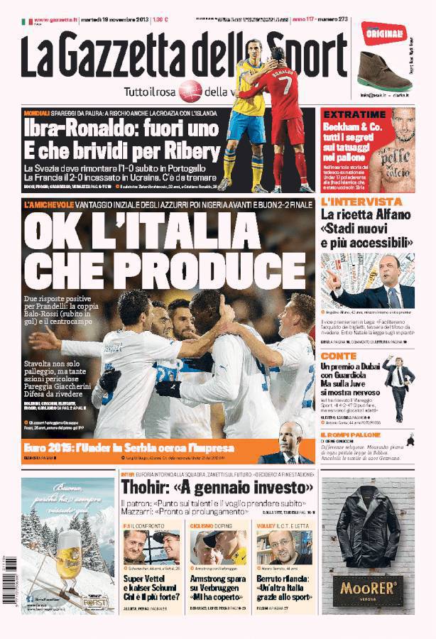 GAZZETTA ITALIA – Convincente prova degli azzurri di Prandelli contro la Nigeria, finisce due a due il match ma si può sorridere.
