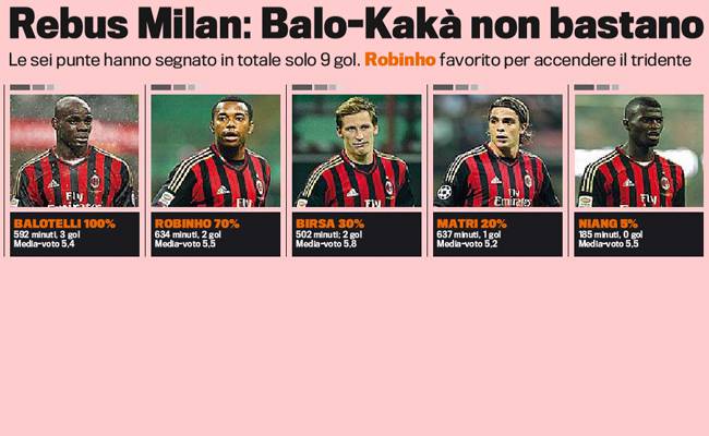 MILAN BALOTELLI KAKA’ ATTACCANTI FOTO – Il Milan ha bisogno di trovare la vena realizzativa dei suoi attaccanti. Basti pensare che il capocannoniere dei rossoneri è Mario Balotelli a quota 3 gol. Manca sicuramente un altro giocatore che possa davvero aiutare in fase realizzativa i rossoneri, per questo già contro il Genoa il tecnico Massimiliano Allegri cercherà di ritornare al tridente d’attacco. Oltre al rientrante Balotelli ci sarà Kakà che è diventato indispensabile per i rossoneri. Accanto a loro due dovrebbe esserci un altro attaccante, El Shaarawy al massimo andrà in panchina, mentre ci sarà un duello tra Matri e Robinho con il secondo favorito.