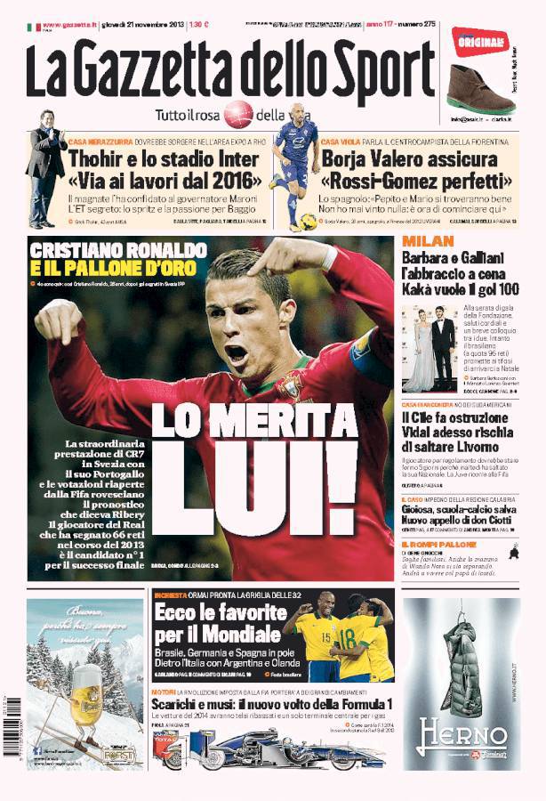 GAZZETTA RONALDO – Sulla Gazzetta dello Sport si parla del Pallone d’Oro che adesso vede Ronaldo super favorito.