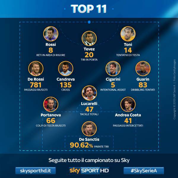 SERIE A TOP 11- Ogni campionato ha una top 11. In quella spagnola si possono finalmente schierare insieme Messi e Ronaldo, ma anche la top 11 italiana non è niente male. In porta, secondo Sky, c’è De Sanctis, che ha parato il 90,62% dei tiri. La difesa è composta da Portanova (66 colpi di testa riusciti), Lucarelli (47 tackle totali) e Costa (ben 41 passaggi interrestati). A centrocampo, insieme a Cigarini (5 assist), anche Guarin (83 dribbling tentati), Candreva 135 cross, e De Rossi 781 passaggi riusciti. L’attacco è stellare: Tevez (20 tiri in porta), Toni (14 tentativi di testa) e Giuseppe Rossi (8 gol in area di rigore). Manca qualcuno secondo le vostre preferenze?