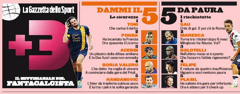 FITI FANTACALCIO GAZZETTA 5 DA METTERE 5 DA RISCHIARE – Ritorna finalmente il campionato e ritorna, ovviamente, anche il fantacalcio, gioco che appassiona tantissimi italiani. La Gazzetta dello Sport, noto quotidiano che da diversi anni organizza il suo fantacalcio, ha come ogni settimana redatto una top di calciatori da schierare e da rischiare in questo 13° turno di Serie A. Da mettere in campo certamente Luca Toni e Paul Pogba, sponsorizzati fortemente dalla “rosea” per le sfide interessanti di questa giornata; se volete invece prendervi un bel rischio provate con Sau, Maresca o Balotelli, chiamati a grandi prestazioni.