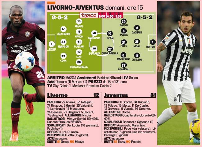 FOTO LIVORNO JUVENTUS PROBABILI FORMAZIONI VIDAL EMEGHARA – Match delicatissimo quello di domenica per Livorno e Juventus squadre certamente alla ricerca di una vittoria importante in questo 13° turno. I labronici per 3 punti che, oltre a far classifica, aiuterebbero psicologicamente per la risalita; i bianconeri per prepararsi al meglio in vista della delicata sfida di mercoledì contro il Copenaghen, decisiva per la qualificazione Champions. Occhio alle scelte dei due tecnici, chiamati a sostituzioni importanti a causa di squalifiche o infortuni: il Livorno dovrà sostituire il bomber Paulinho con uno spento Emeghara, sin qui totalmente differente dal bomber visto nella scorsa stagione a Siena; i bianconeri senza Bonucci, Ogbonna, Pepe, Lichtsteiner, Isla, Barzagli e con Giovinco e Vucinic a mezzo servizio, sacrificheranno Vidal da centrale di difesa.