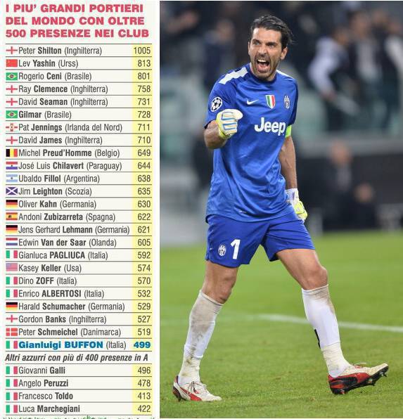 FOTO BUFFON 500 PRESENZE SERIE A – Un record davvero importante quello di oggi per Gigi Buffon che, grazie alla gara vinta dalla sua Juventus contro il Livorno al Picchi, ha raggiunto quota 500 presenze in Serie A con la maglia delle squadre di club. Un traguardo sensazionale per l’estremo difensore di Massa Carrara, pronto a giocarsi le sue carte anche nel mondiale 2014 con la maglia della sua nazionale. Sono davvero tanti però i “colleghi” di Buffon ad aver superato abbondantemente quota 500. Uno su tutti? Il leggendario portiere britannico, Peter Shilton, capace di disputare in carriera la bellezza di 1005 partite. Difficile Buffon si possa avvicinare a questa quota spropositata, ma Buffon non ha di certo bisogno di questo ulteriore record per restare nella storia del calcio.