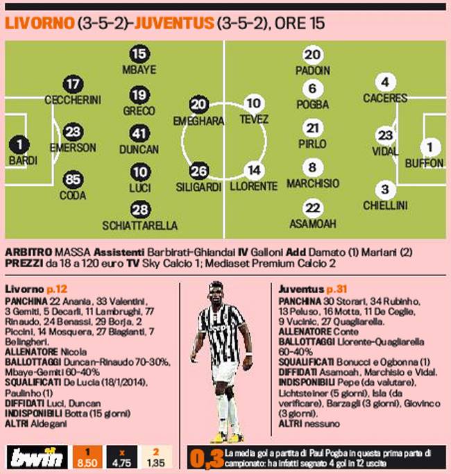 LIVORNO JUVENTUS PROBABILI FORMAZIONI – Nonostante l’emergenza in difesa, Antonio Conte non cerca scuse e a Livorno andrà a caccia del primo posto in classifica in attesa del match tra Roma e Cagliari, in programma domani sera. Contro il Livorno, però, non sarà facile. La squadra toscana ha dimostrato di poter far male anche se dal punto di vista tecnico non c’è paragone tra le due formazioni. Nicola schiererà la sua squadra con il 3-5-2 con Bardi in porta, Coda, Emerson e Ceccherini in difesa. Schiattarella, Luci, Duncan, Greco e Mbaye a centrocampo. Siligardi ed Emeghara in attacco. Conte risponde con il 3-5-2 con Buffon, alla 500esima presenza in serie A tra i pali. Cáceres, Vidal e Chiellini in difesa. Padoin, Pogba, Pirlo, Marchisio e Asamoah a centrocampo. Tevez e Llorente in attacco.